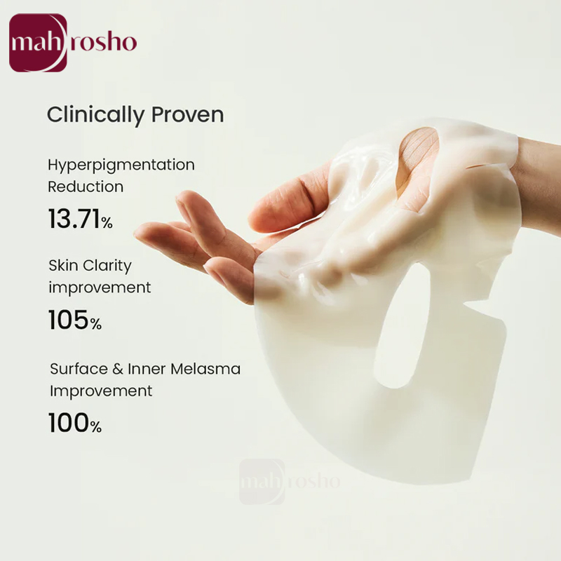 یک ماسک هیدروژلی پیشرفته با بافتی غلیظ و تکنولوژی جذب عمیق است که با بهرهگیری از ترکیبات مؤثر و نوآورانه، بهطور هدفمند بر کاهش لکهای تیره، بهبود تیرگی و یکنواخت سازی رنگ پوست اثر میگذارد. این ماسک پس از قرارگیری روی پوست، با آزادسازی تدریجی مواد فعال، بهمرور شفاف میشود تا نشان دهد که مواد مؤثر به طور کامل جذب بافت پوست شدهاند.