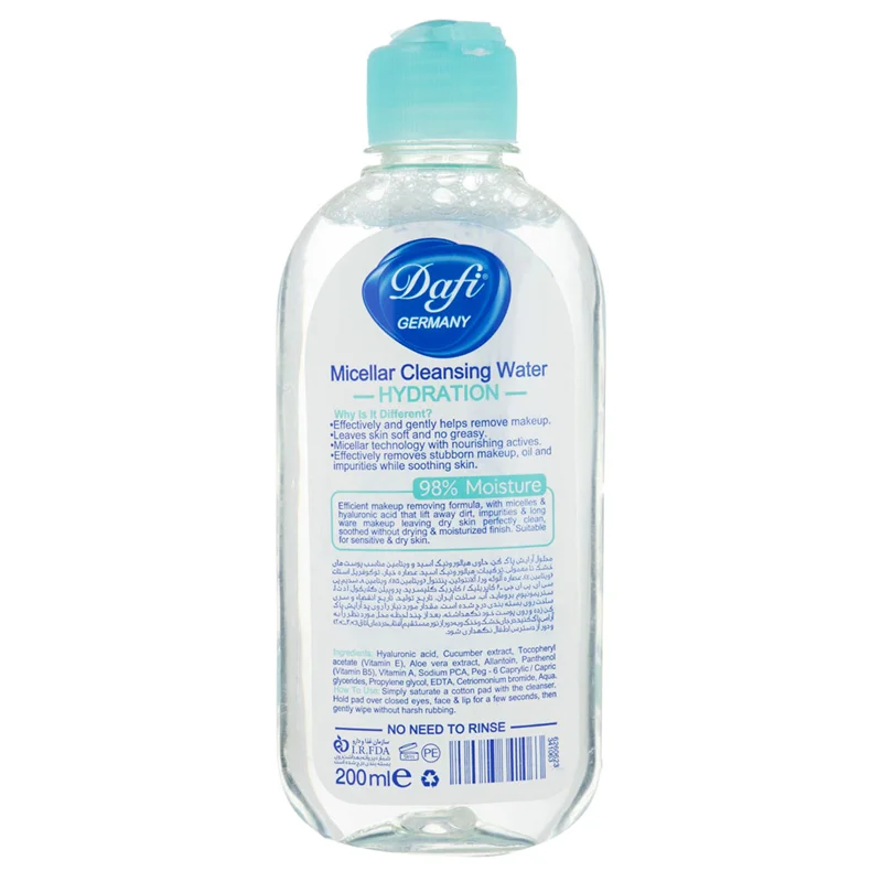 محلول پاک کننده صورت و آرایش یا همان میسلارواتر دافی مدل Hydration با خاصیت آبرسانی فوق العاده، بدون ایجاد خشکی پوست را عمیقا پاک میکند. این میسلار واتر مناسب پوست های خشک تا نرمال میباشد. این محلول حاوی هیالورونیک اسید و ویتامین های E و B5 میباشد.