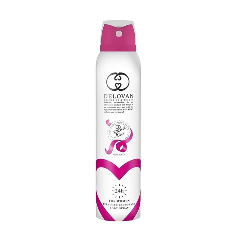 "اسپری خوشبو کننده بدن زنانه دلوان"...اسپری خوشبو کننده بدن Nina Ricci زنانه 24 ساعته دلوان بارایحه گرم و شیرین، باعث طراوت و شادابی در طول میشود. این محصول مناسب استفاده روزانه بانوان بوده و بدون ایجاد حساسیت و لک روی لباس است.
