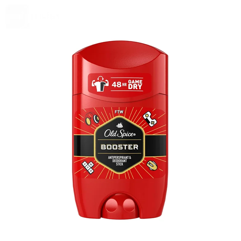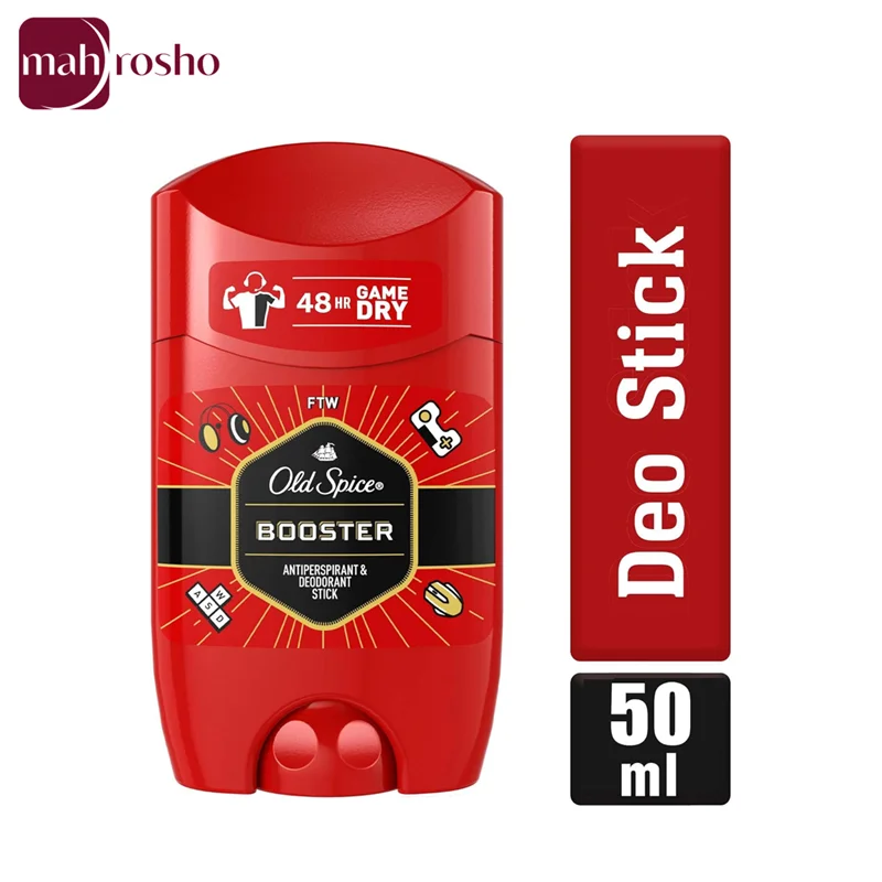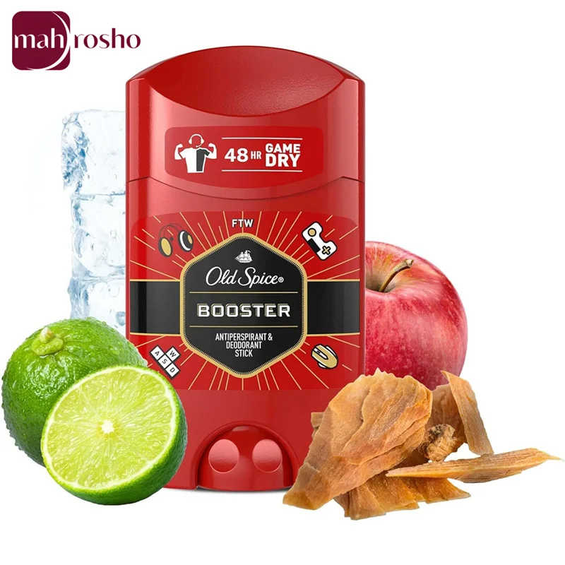 "استیک دئودورانت ضد تعریق اولد اسپایس".... استیک دئودورانت ضد تعریق اولد اسپایس مدل Booster، دارای رایحه خنک و تند میباشد. اثر این استیک تا 48 ساعت روی پوست ماندگاری دارد و فاقد الکل، پارابن بوده و هیچگونه لک و سفیدکی روی لباس سفید و مشکی بر جای نمیگذارد. استیک دئودورانت Old Spice، برای استفاده در فعالیتهای ورزشی با تعریق بالا ساخته شده و برای ورزشکاران گزینه مناسبی میباشد.