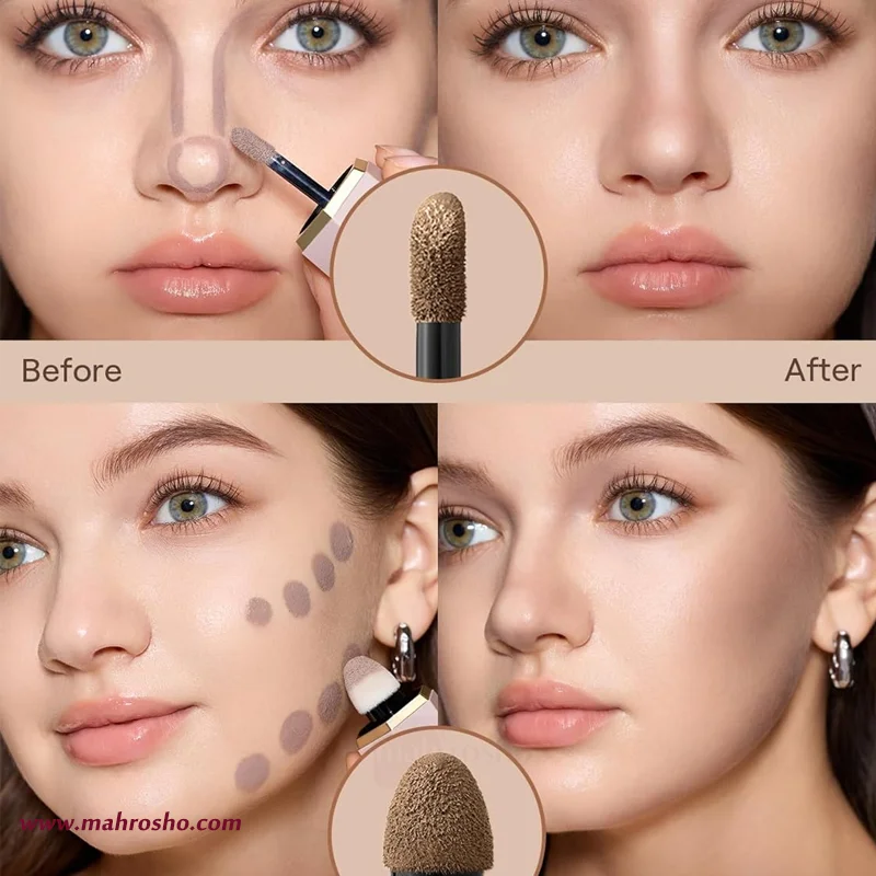 • طراحی دو سر حرفه‌ای: مجهز به دو اپلیکاتور مجزا؛ نوک دقیق برای طراحی خطوط کانتور و اسفنج نرم برای ترکیب آسان و سریع.