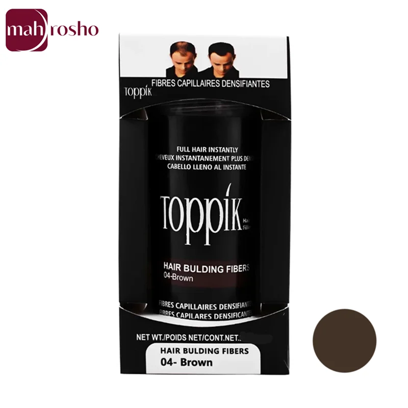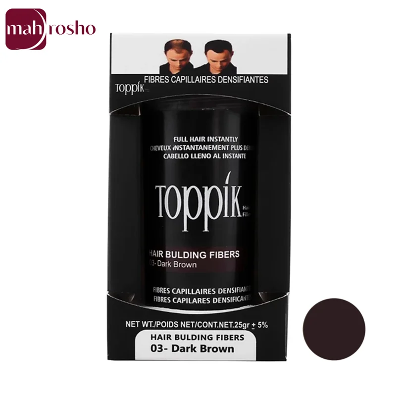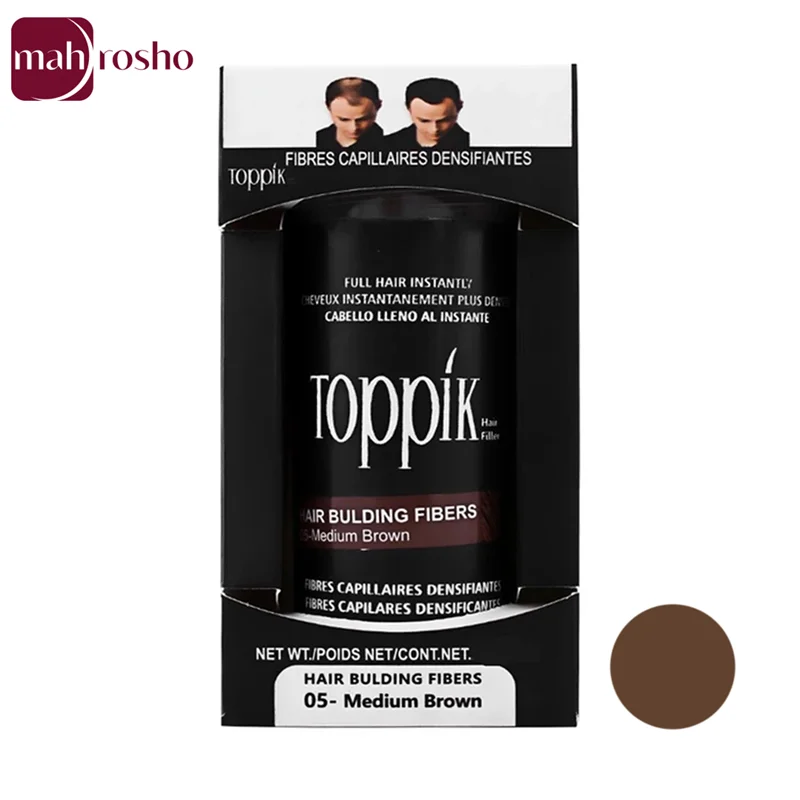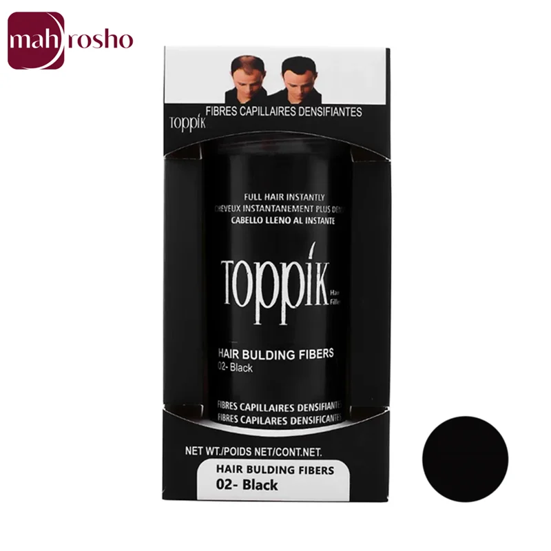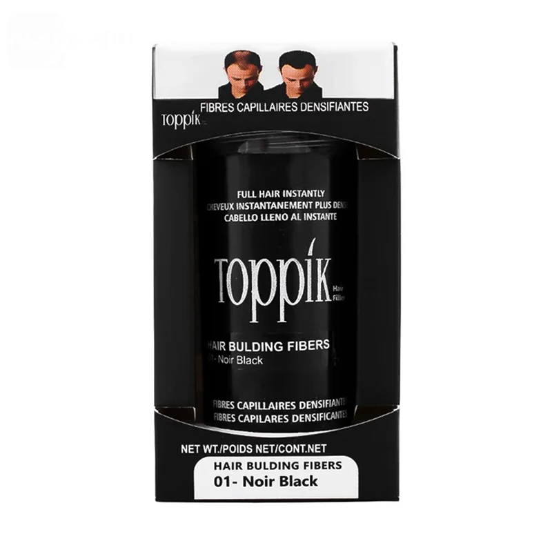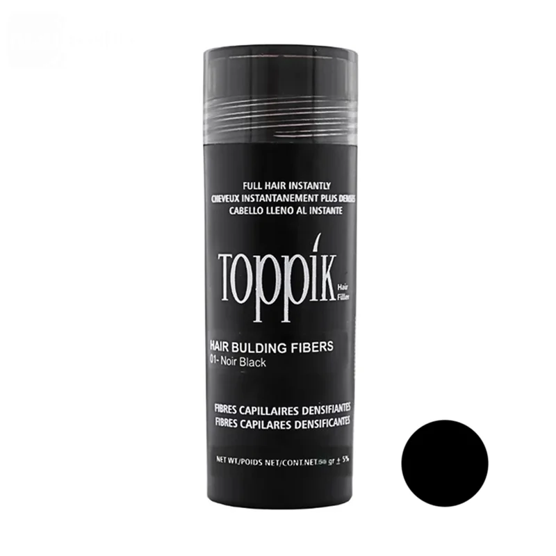 "پر کننده مو تاپیک"... الیاف تاپیک از پروتئین کراتین رنگی و طبیعی ساخته شده است که بار استاتیکی دارد و با موهای موجود شما درهم آمیخته میشود. این پودر در برابر باد، باران و تعریق مقاوم است اما به راحتی با شامپو پاک میشود. پر کننده مو تاپیک، یک محصول طبیعی و بدون عوارض با خاصیت ضد باکتری و ضد ریزش مو میباشد.